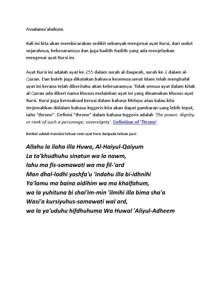 Makna ayat kursi, kelebihan ayat kursi, ayat kursi rumi dan sebagainya. Ayat kursi rumi terjemahan bahasa melayu 1001 ucapan. Tahukah kalian apa maksud terjemahan dari ayat kursi ini?
